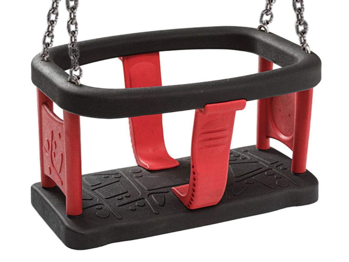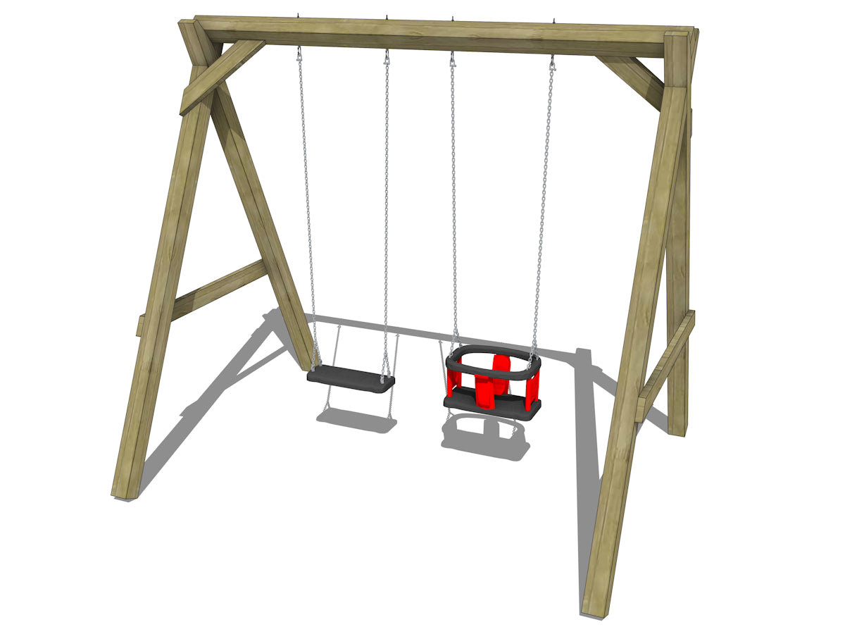 Fornita con n°1 seduta a tavoletta professionale , n.°1 seduta a cestello 1-3 anni (entrambe realizzate in gomma con inserto in lamiera di alluminio e catene anti-intrappolamento delle dita) e n°4 ancoraggi a vite zincati a caldo (non richiedono fondamenta)