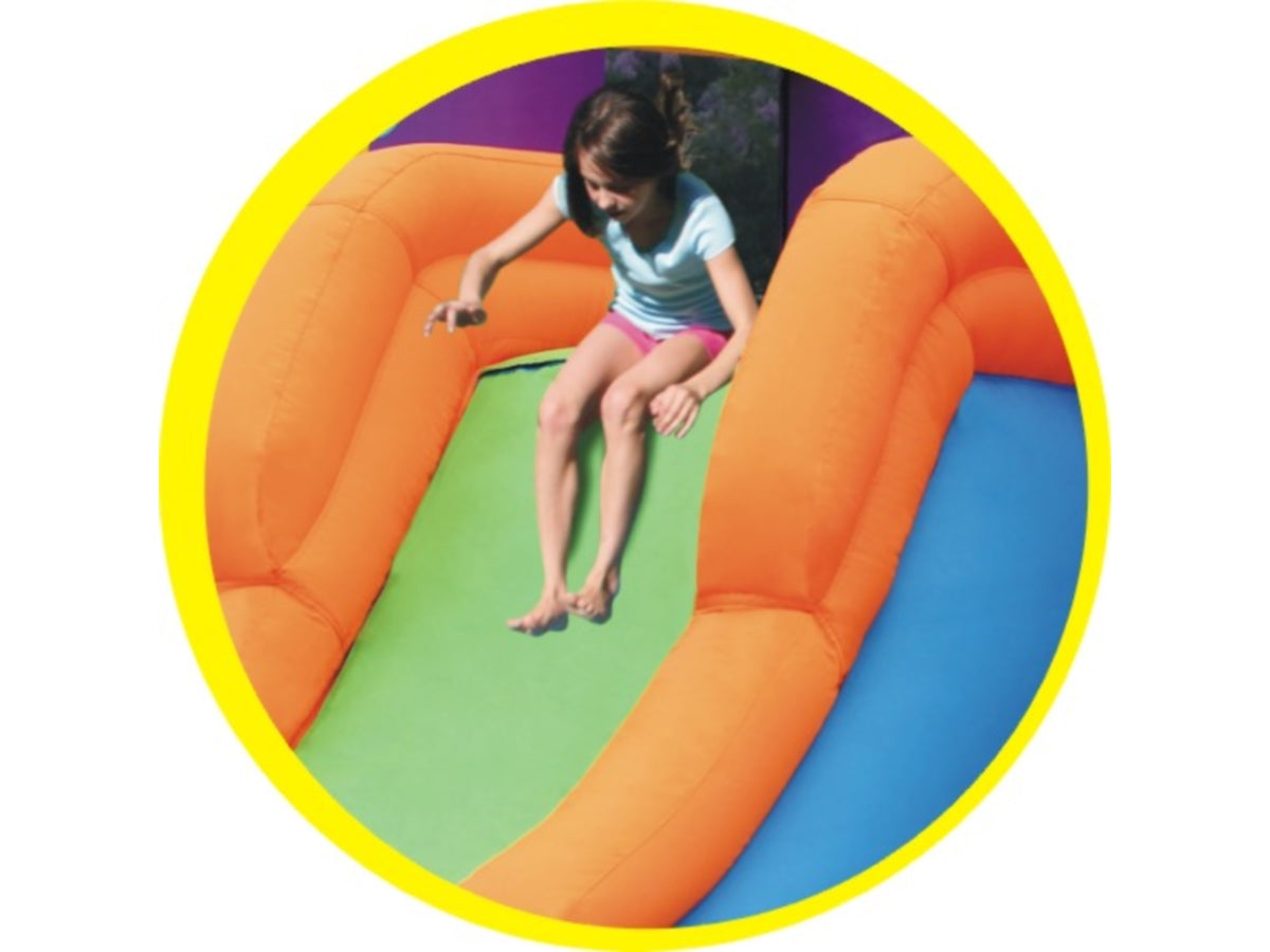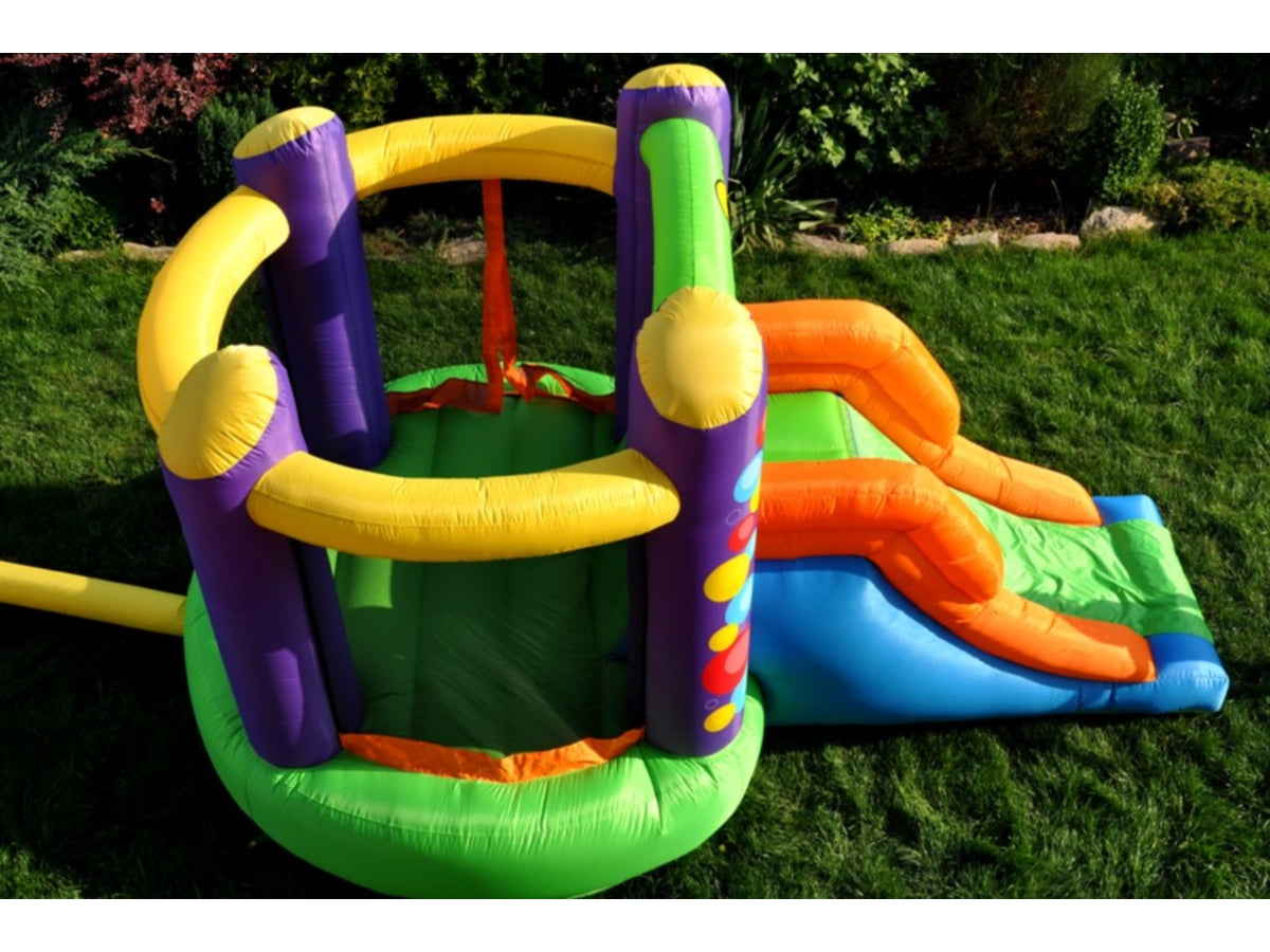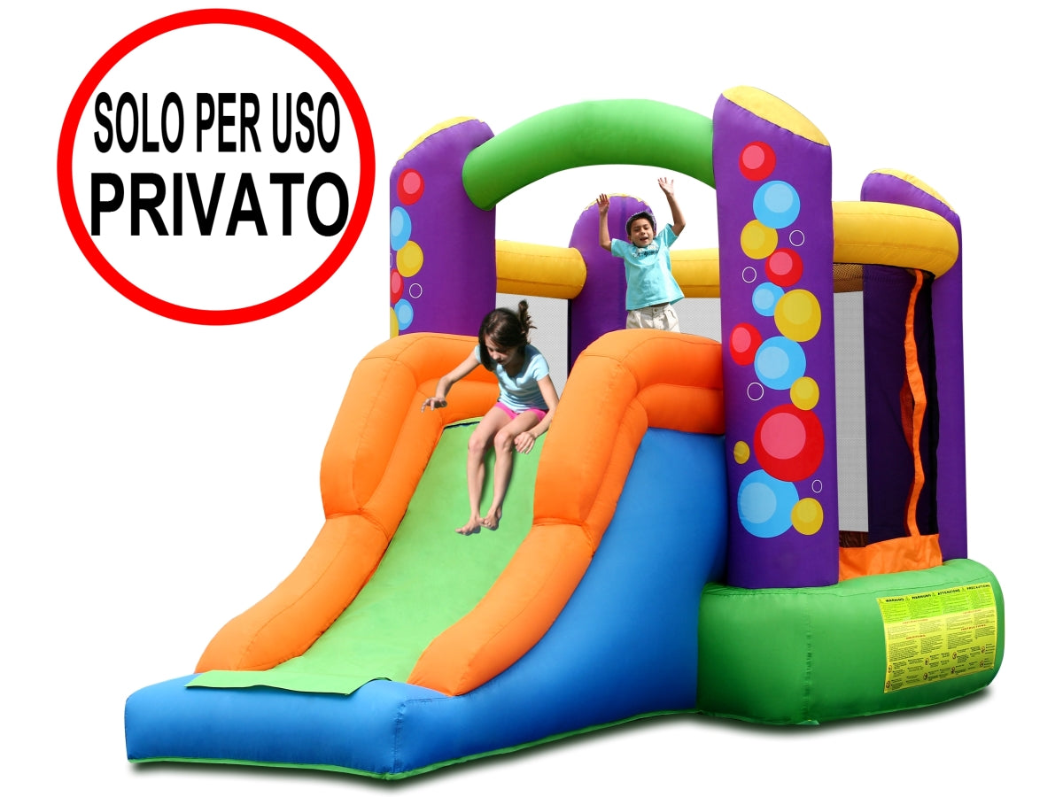 Gonfiabile per uso residenziale con zona salto e scivolo adatto per ambienti interni ed esterni, si gonfia in meno di un minuto.