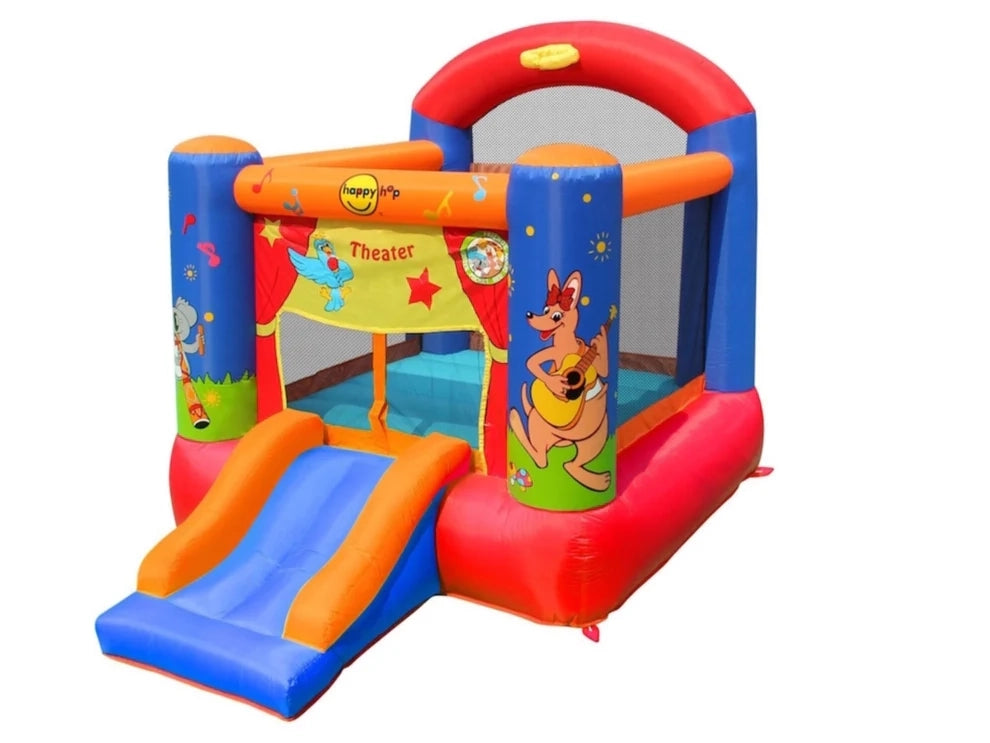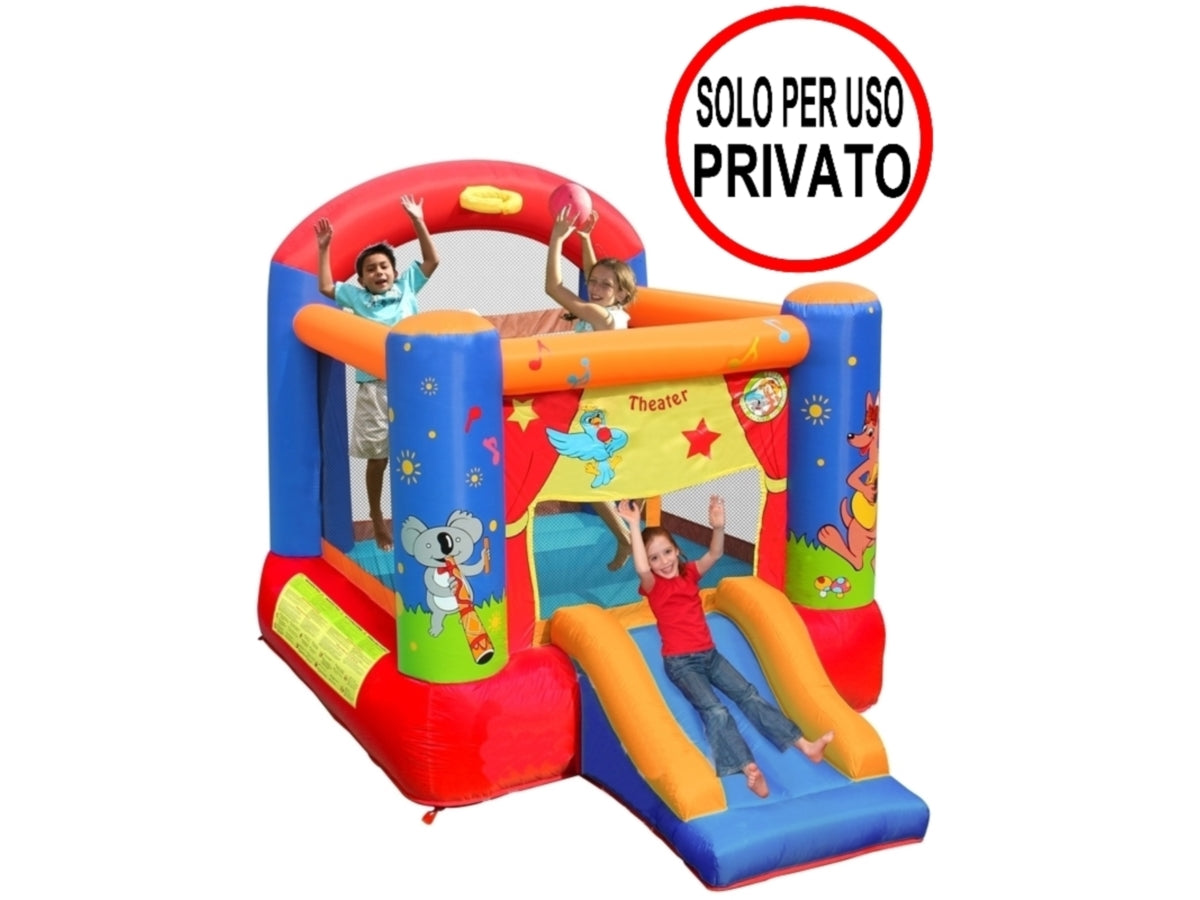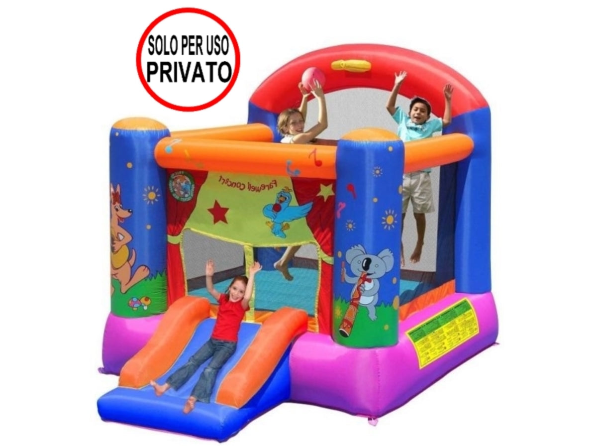 Gonfiabile per uso residenziale con zona salto e scivolo adatto per ambienti interni ed esterni, si gonfia in meno di un minuto.