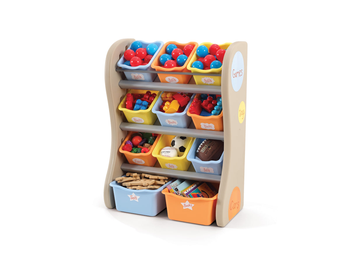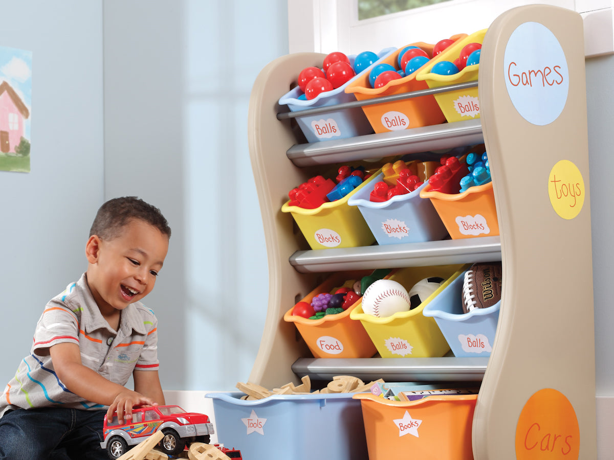 L'ordina mobile presenta un design colorato e accattivante, ideale per le camerette dei bambini. La struttura è realizzata in plastica resistente, con una combinazione di colori neutri e vivaci. I contenitori sono di diverse dimensioni e colori, per facilitare l'organizzazione dei giocattoli.
